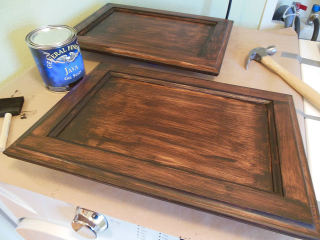 Back then, Pinterest was really starting to hit its stride and I had seen lots of dark kitchen cabinets that were gel stained. I was intrigued because their claims of little sanding/prep-work, little cost, and a relatively quick turnaround time. Being a penny-pinching newlywed, I gave it a shot. First with our half bath vanity, because I figured it would be the cheapest one to replace if it went wrong.